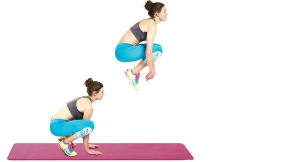 From here, jump up as high as you can, switching leg position in the air to land in the start position but with the opposite foot in front.
