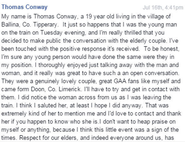 In the message, Thomas says that it was no hardship chatting to 'the genuinely lovely' couple sitting near, saying they were fellow GAA fans.