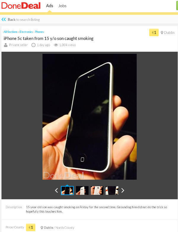 After catching his son in the act on Friday, the father decided to sell his iPhone 5c on DoneDeal.ie for just a single euro.