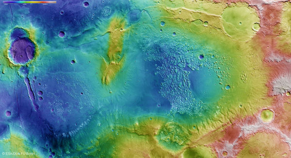 The ESA also released a "heatmap" of the region - called Terra Sirenum, colour-coded to show reds and whites as the highest points and blues the lowest depths.