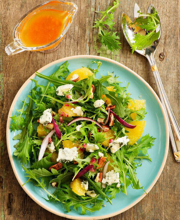 Toss the red onion, through the leaves and gently toss in the dressing. Add the pecans and cheese and serve with the nice crunchy bread.