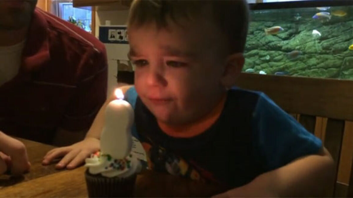This two-year-old can't quite blow out his birthday candle and it’s adorable