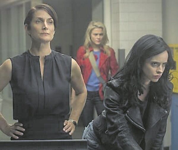 Shooting the 13-episode series was akin to making a movie, says Carrie-Anne Moss (Trinity in The Matrix), who plays Jones’s mercurial corporate employer, Jeri Hogarth (a man in the original strip).