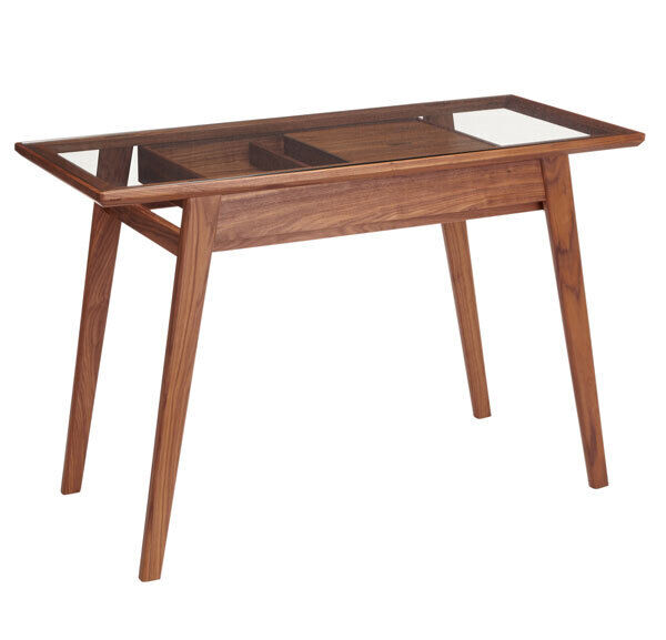 The legs are gently tapered and the collection uses glass tops to highlight the solid walnut and real walnut veneer.