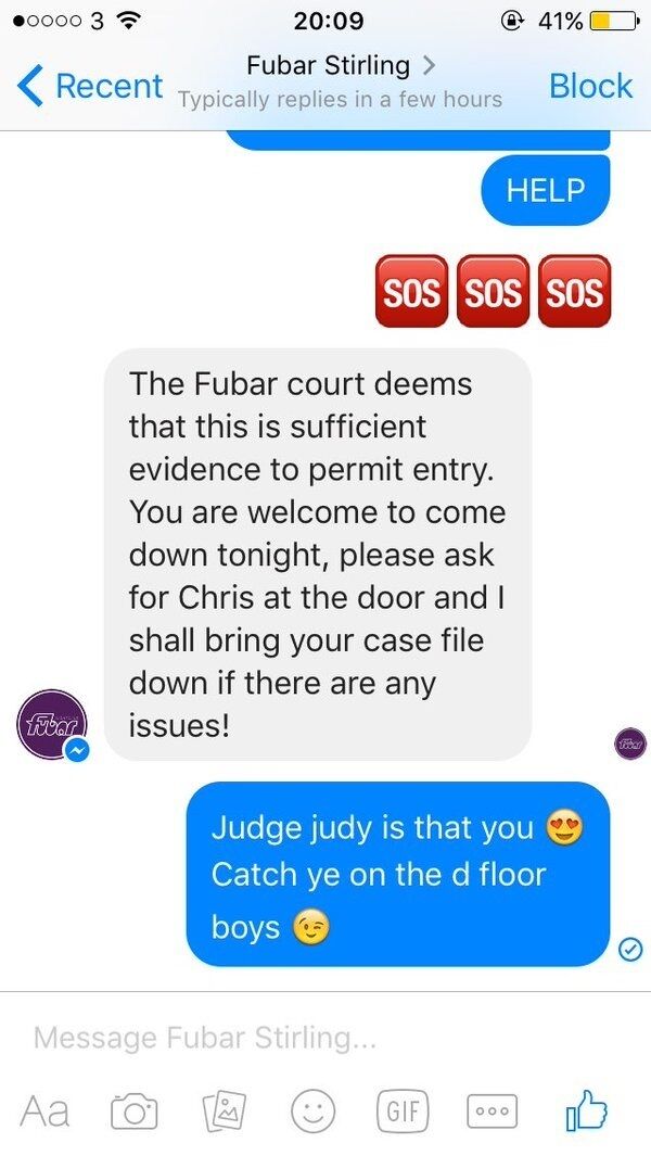 Humoured by the efforts of the young man to enjoy a night in their fine drinking and dancing spot, the powers that be at Fubar Stirling, the ’premier venue of Stirling’, Scotland wrote back agreeing to allow the eager beaver in for a night of frolics and fun.