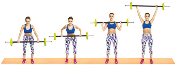 Holding a barbell in front of your thighs, bend your legs to create momentum, then extend your legs and row the barbell up towards your chin.