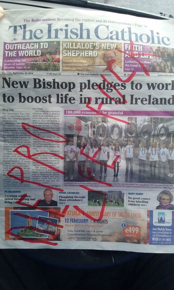 When he went to investigate he found a copy of the Irish Catholic newspaper in his letterbox with the words "Die pro life f**k" boldly written across the front in red ink.