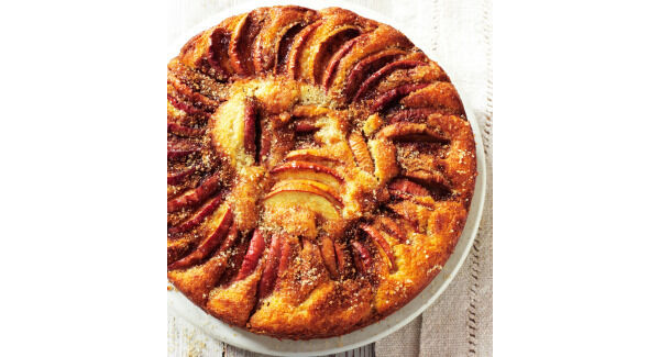Transfer the batter to the cake tin. Arrange the apple wedges in a spiral over the batter. Mix the sugar and cinnamon together and sprinkle on top.
