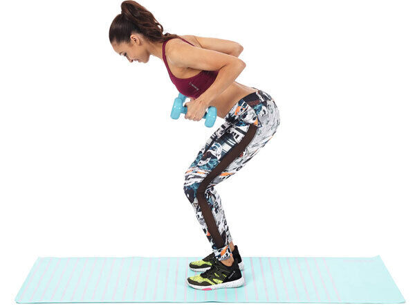 * Keeping a bend in the knees, hinge at the hips so that your upper body is at a 45-degree angle from the floor, holding a dumbbell in each hand with arms extended towards the floor.