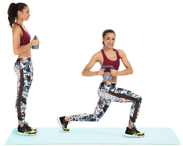 * Holding a weight in front of your chest, take a large step forwards and bend both knees to about 90 degrees with the back knee just above the floor.