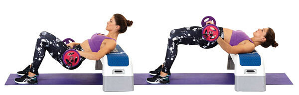 * With a barbell resting on the soft part of your hips (hands gently holding it in place), back against a bench and feet flat on the floor, hover your bottom just off the floor.