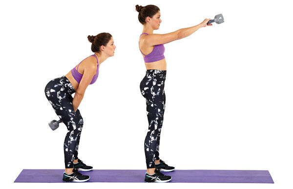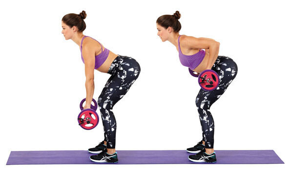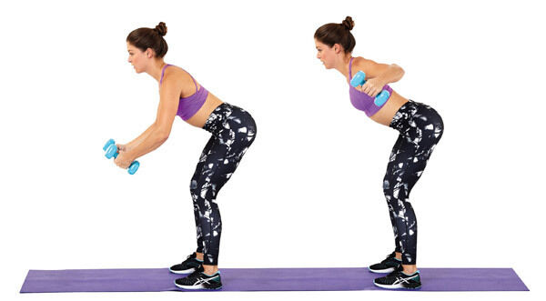 * Holding a dumbbell in each hand with arms extended towards the floor and palms facing each other, keep a bend in the knees and hinge forwards at the hips so that your torso is almost parallel to the floor.
