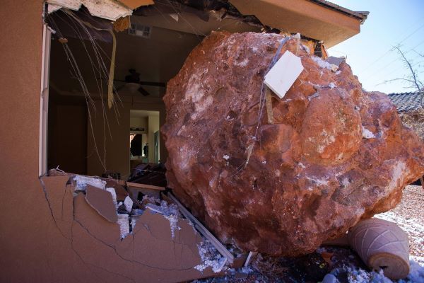 Our photo shows a massive rock embedded in the home of 63-year-old Wanda Denhalter in St George, Utah.