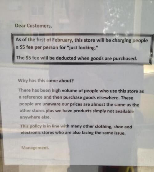 That's what one retailer in Brisbane, Australia has done in an effort to put off customers who come in to check out goods - and then go elsewhere to buy them.