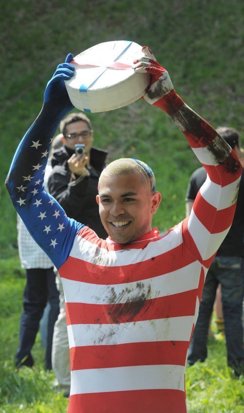 An American daredevil defied health and safety warnings to win an annual Cheese Rolling competition in the UK yesterday.