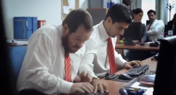 Suarez plays the part of an Abitab employee and parodies his on pitch personality in an office scenario.