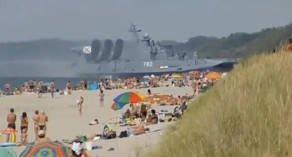 Beachgoers were left startled when a 60 metre military hovercraft unexpectedly landed on a busy beach in Russia.