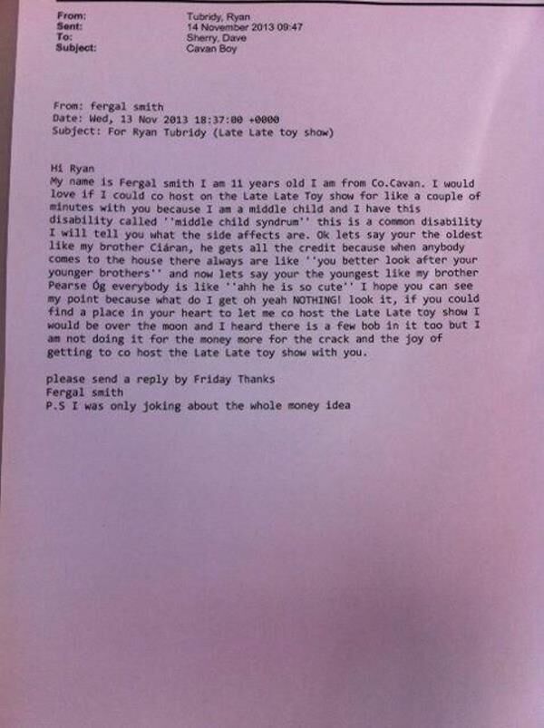 So the enterprising lad took it upon himself to pen an email to Ryan Tubridy, which the Tubmeister read out on his 2FM radio show this morning.