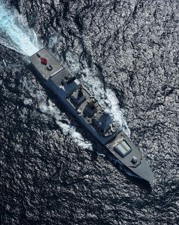 … although they do happen to be using a Royal Navy Destroyer to say it. This beast is a guided missile warship, with buckets of missiles and Harpoon launchers, not to mention the helicopters.