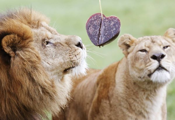 — Dudley and Saskia, African lions in Scotland's Blair Drummond Safari Park, enjoy a heart-shaped treat made of frozen horse blood. (Bleeding heart. Geddit?)