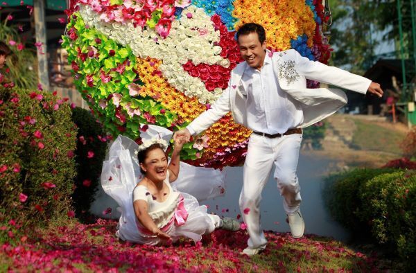 This is called the Runway of Love, where, apparently, couples run away from a giant ball decorated with flowers. This couple – Wichan Vina, 32, and his bride Wilailuk Roongros, 31 – took a tumble on the way.