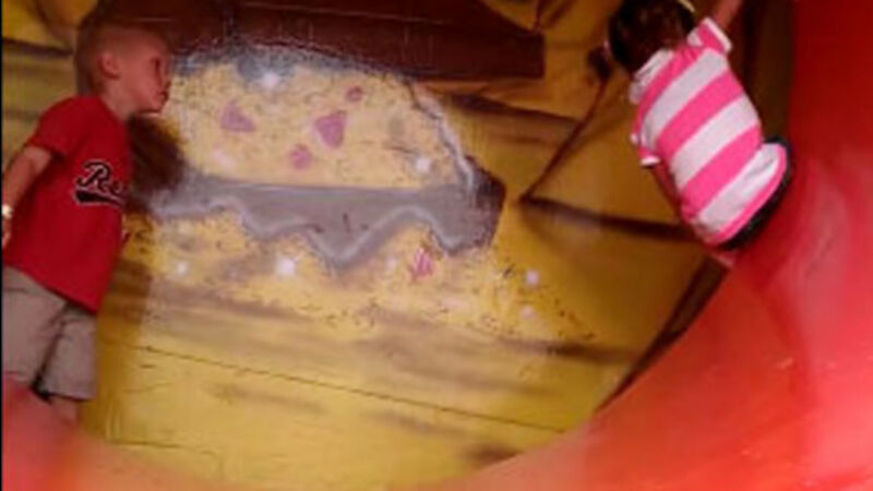 This little girl was a bit hesitant crossing a rotating tunnel ride at a fairground so her mother started coaxing her on from the other side. she hangs on to the side of the ride while rotating 360 degrees in the air - defying gravity, logic and fear.