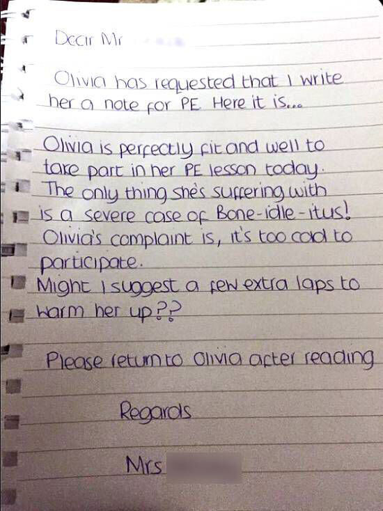 That’s what Olivia’s mum, Sam, did recently before posting an image of the note on Facebook with the comment: “Well here you go Olivia here's your note for PE, it will be sealed & in an envelope ready for her to hand to the head in the morning.”