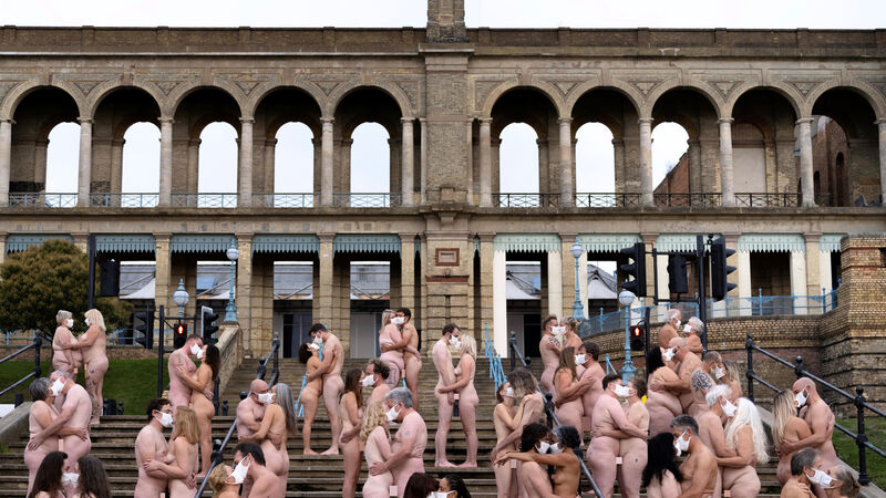 Volunteers have stripped naked – apart from their masks – for a socially distanced art installation.