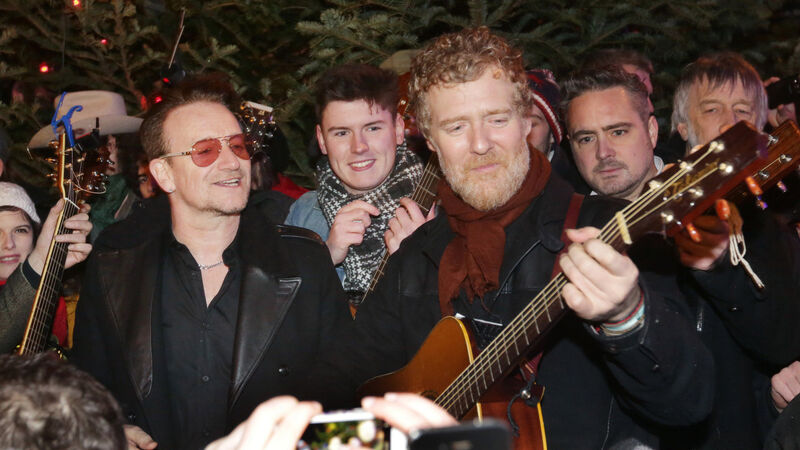 Bono and Glen Hansard lead musicians busking on Grafton Street in Dublin in what has become a traditional Christmas Eve charity fundraising event. Photo: Laura Hutton/RollingNews.ie