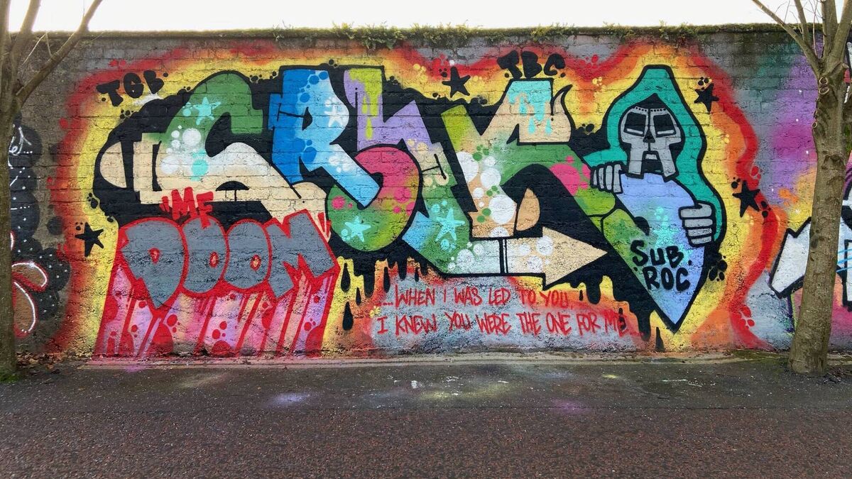 A graffiti piece made in honour of the late rapper and producer MF DOOM, visible on Ferry Walk, next to Fitzgerald's Park, Cork. Pic: Trixy