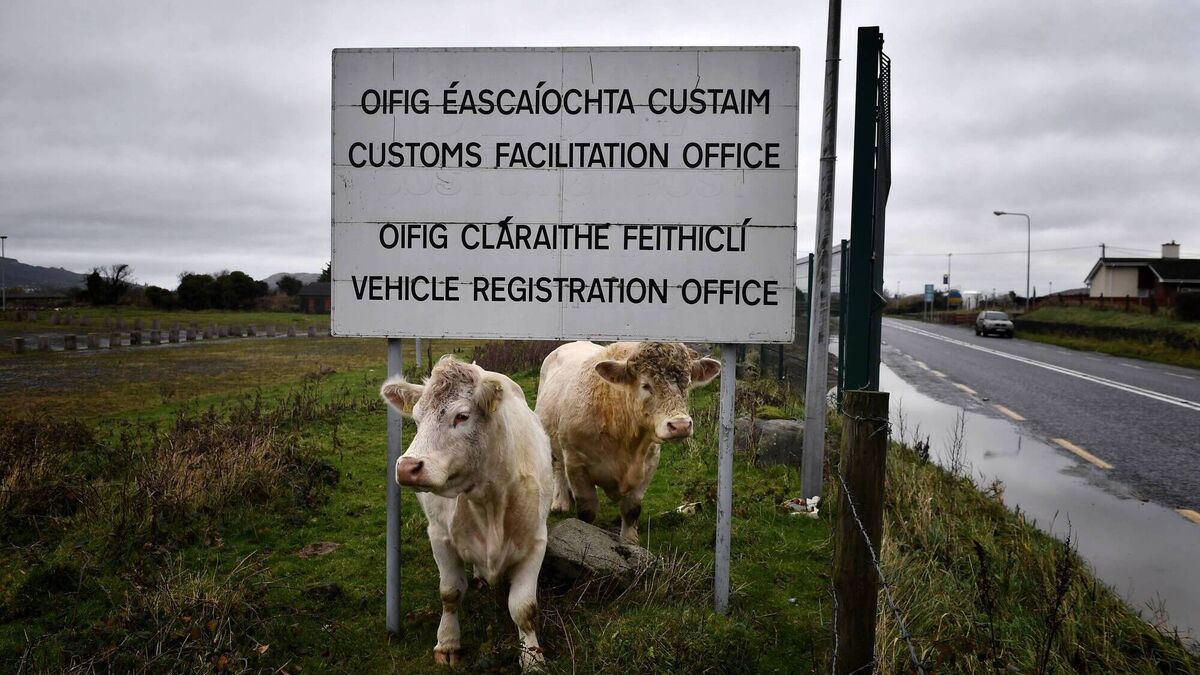 Cows stand beneath a sign for the disused Customs Office along the British border on November 14, 2018 in Newry, Northern Ireland. The Poetry Programme presents poems inspired by the border, Sunday 7.30pm, RTÉ 1. Pic: Charles McQuillan/Getty Images.