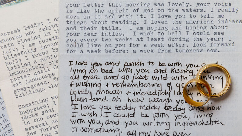Letters written to Ted Hughes by American poet Sylvia Plath, and their gold wedding rings, which are some of the items belonging to Sylvia Plath going under the hammer at Sotheby's on July 9. The collection of letters and personal items - including passionate notes written to husband Ted Hughes following their marriage - come from the collection of Frieda Hughes, one of the couple's two children. Picture: Sotheby's/PA Wire