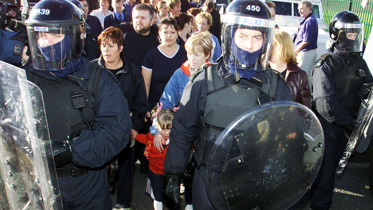 Alice-Lee Bunting, 5, seen through a RUC human cordon, being comforted by her mother, as she is escorted to Holy Cross school, north Belfast in June of 2001. Scannal, RTÉ One, 7pm
