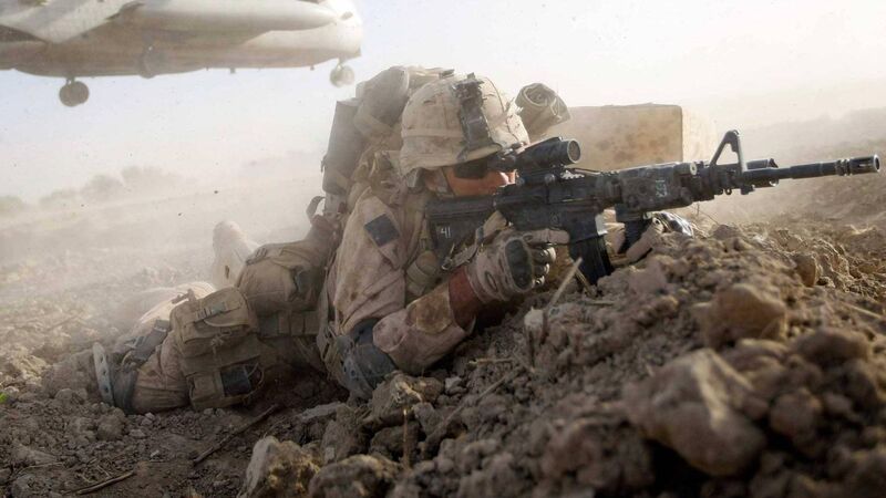 A U.S. Marine from 2nd Marine Expeditionary Brigade, RCT 2nd Battalion 8th Marines Echo Co. takes up a fighting position after off loading from a helicopter during the start of Operation Khanjari on July 2, 2009 in Main Poshteh, Afghanistan.