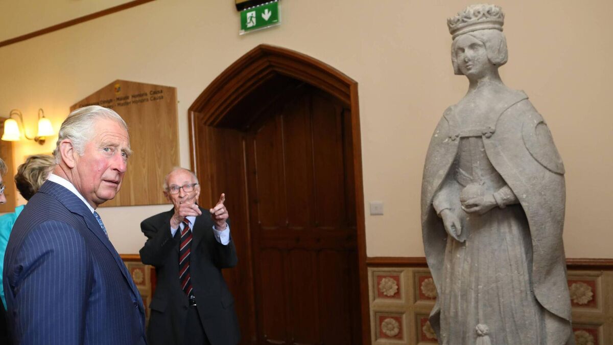 Prince Charles passes by the statue of Queen Victoria at UCC during his visit to the college in 2018, with Prof John A Murphy in the background. Picture: Julien Behal Photography