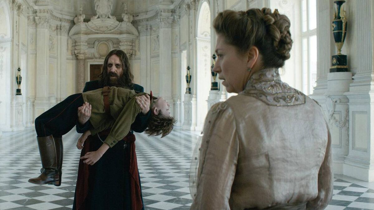 The King's Man: Rhys Ifans as Rasputin, carrying Alexander Shefler, with Branka Katic looking on.