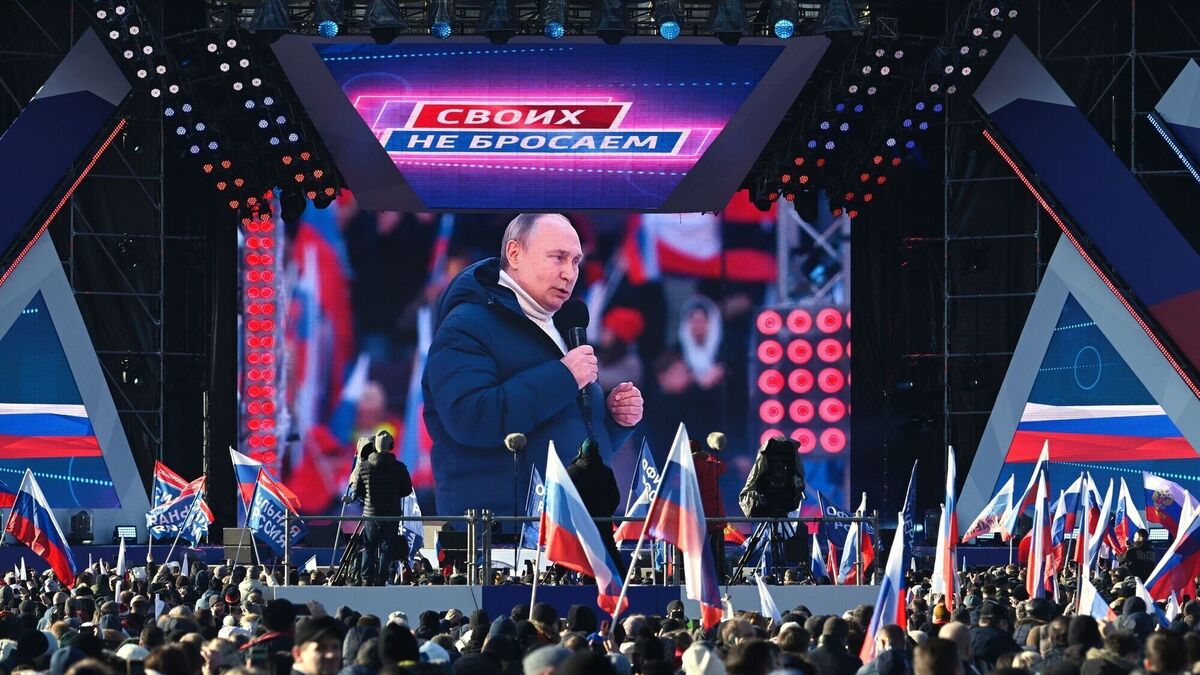 Russian president Vladimir Putin seen on the big screen as he delivers his speech in Moscow, Russia. Such extravagant and egotistical displays of power are typical of the political strongman, along with lies, disinformation and the cult of personality. Picture: Vladimir Astapkovich/Sputnik Pool Photo via AP