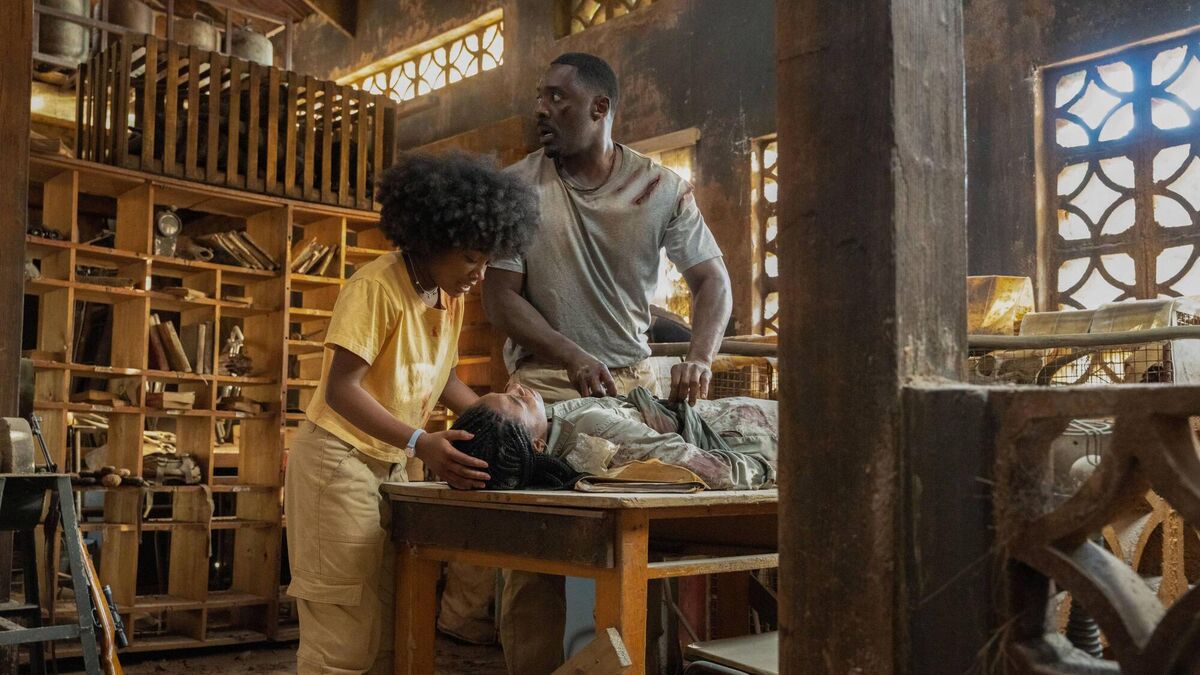 L-R: Norah Samuels (Leah Jeffries), Dr. Nate Samuels (Idris Elba) and Meredith Samuels (Iyana Halley) in Beast