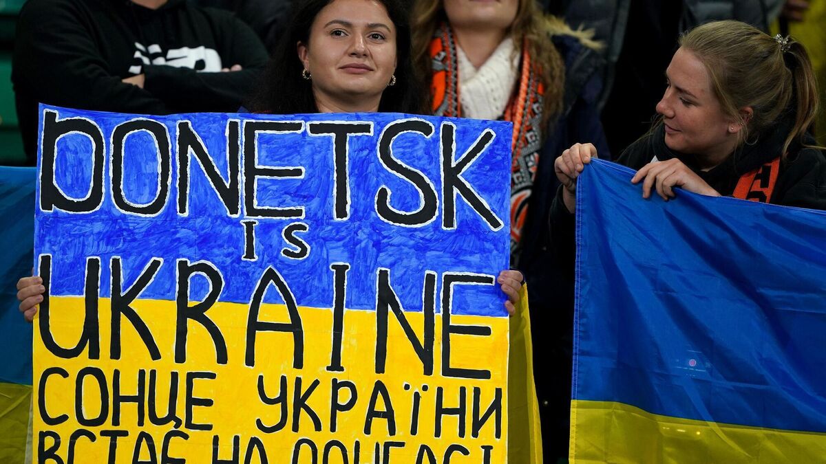 Shakhtar Donetsk fans hold up Ukraine flags and signs during a recent Champions League match at Celtic Park, Glasgow. Picture: Andrew Milligan/PA