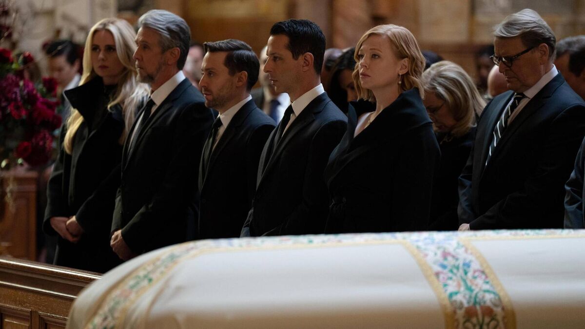 The Roy family stand by the coffin of Logan in Succession.