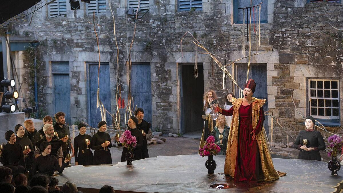 Verdi expands the trio of the original to a coven of 14 that form the female chorus. With wild hair and gothic make up, they set the tone for the dark intrigue of the Shakespearian tragedy in the stable yard theatre.