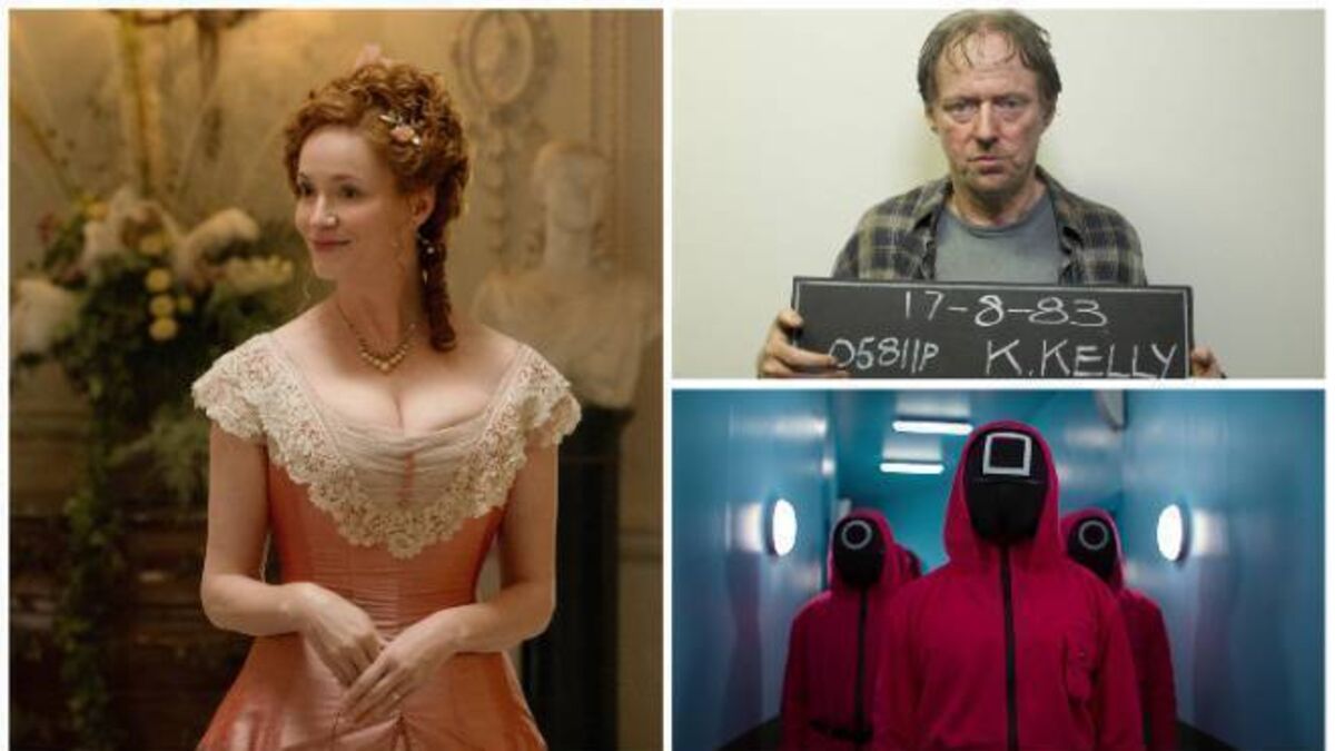 Some of Des O'Driscoll's telly highlights this month, clockwise from left: Christina Hendricks in The Buccaneers; Ned Dennehy in The Nobody Zone; Squid Game: The Challenge bows on Netflix