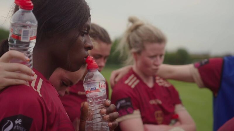 Players with Galway United women's soccer team huddle after a match, in new RTÉ1 series Pass It On: Sacar na mBan