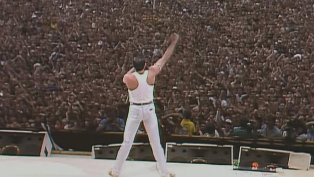 Freddie Mercury gazes out onto the Wembley Crowd at Live Aid. Pic: BBC/Brook Lapping/Band Aid Trust