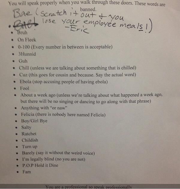 Manager Eric says: āYou will speak properly when you walk through these doors..You are a professional, so speak professionally.ā