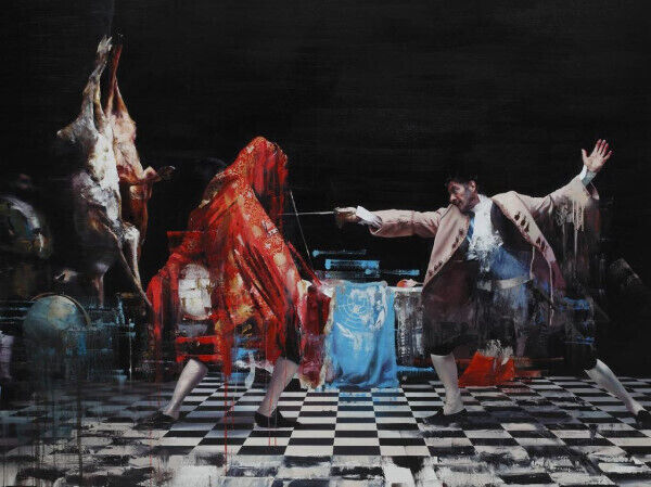 The intricate painting is based on a photoshoot arranged by the artist. He arranged sets and hired actors to create the striking scene.