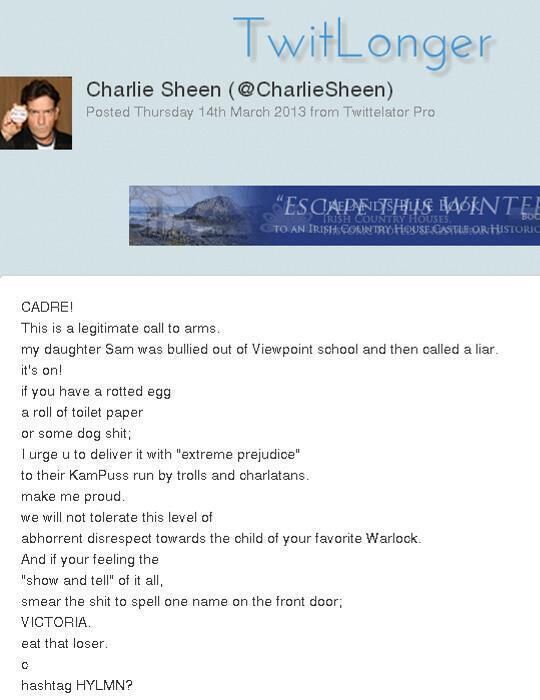 School hits back as Sheen urges fans to smear it with poo