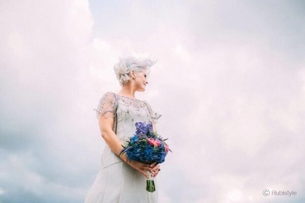 The stylish presenter looked stunning in her silver gown to match her silver locks and held a beautiful blue bouquet that complimented her engagement ring.