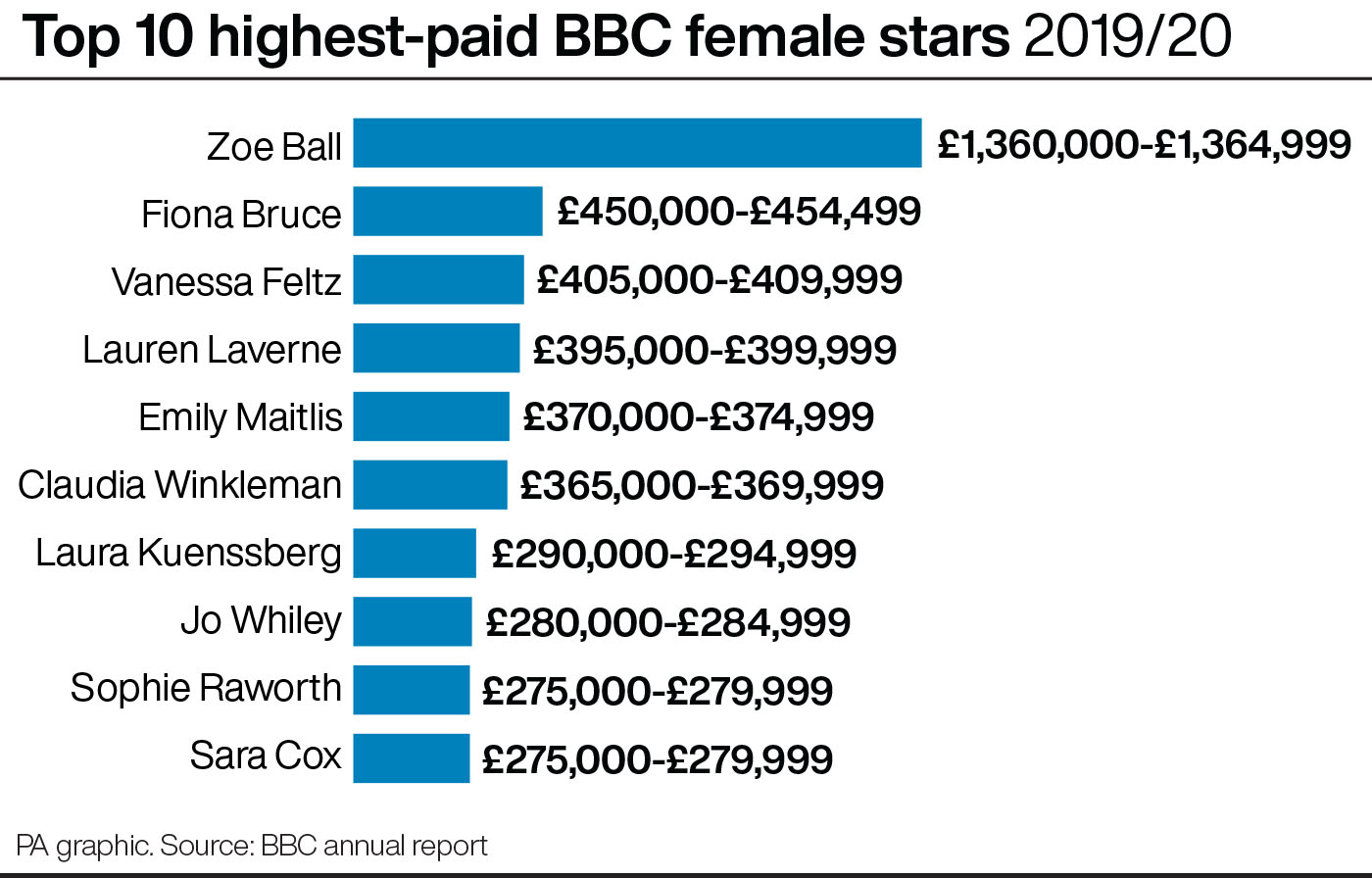 BBC Radio 2 breakfast show DJ Zoe Ball shoots up the list – on £1.36 million, making her the highest-paid woman in the top 10.