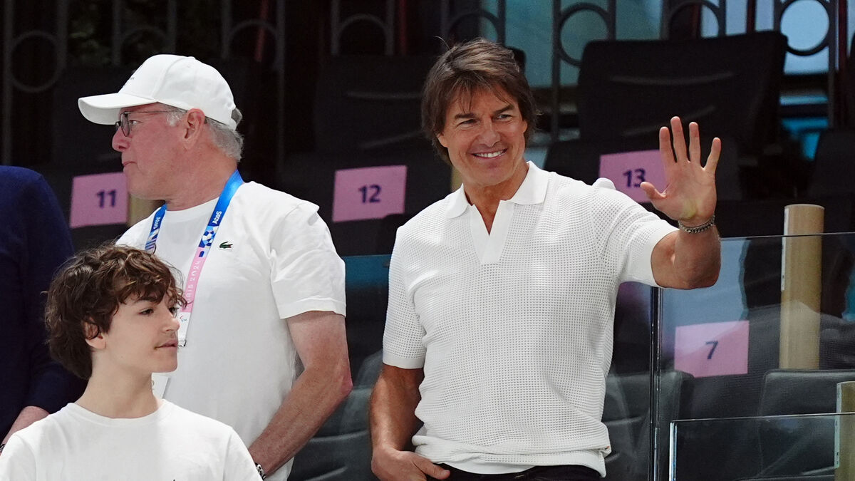 Cruise, wearing a white top, attended the women’s qualification for artistic gymnastics along with Warner Bros Discovery chief executive David Zaslav.